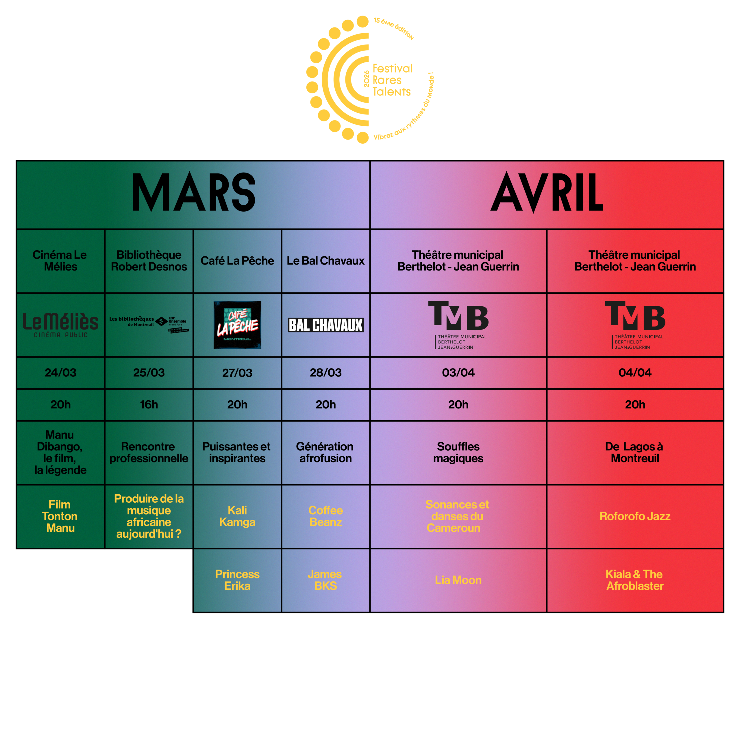 Soyez les bienvenu.e.s au festival Rares Talents dont j’ai l’honneur d’être l’ambassadrice, aux côtés d’un parrain nommé James BKS. Cet artiste multi-instrumentiste réveille l’héritage musical que nous a laissé le compositeur et saxophoniste émérite Manu Dibango, à l’honneur lors de cette 15ème édition anniversaire sise à Montreuil les 24, 25, 27 et 28 mars, 3 et 4 avril 2026.